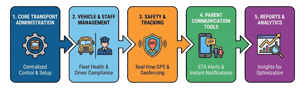 The Transport Module in a School ERP system helps schools manage their entire transportation network efficiently and safely. It centralizes bus routes, stops, vehicle details, driver information, and student trip records in one unified platform. With GPS integration, schools and parents can track buses in real time, ensuring complete transparency and enhanced safety. Automated pickup and drop attendance, speed alerts, breakdown notifications, and emergency messages make the transport system more secure and reliable. The module also supports maintenance reminders, permit expiry alerts, fuel tracking, and transport fee auto-calculation, helping schools reduce operational costs. Overall, the Transport Feature improves coordination, increases safety, enhances communication, and ensures smooth day-to-day transportation operations.
