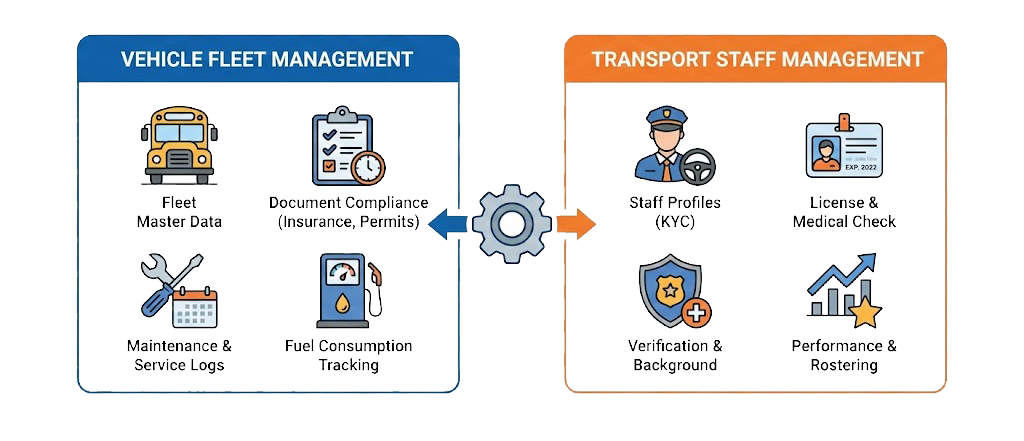 Overview The Vehicle & Staff Management module is the operational backbone of the school transport system. This section is dedicated to maintaining comprehensive, digital records of the entire fleet (buses, vans) and the personnel responsible for operating them (drivers, conductors, attendants).