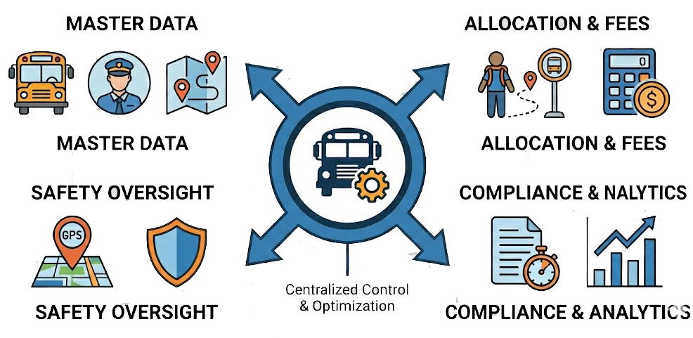 The Administration module acts as the central command center for the entire school transport system. It gives administrators full control over Master Data, allowing them to manage vehicle details, driver profiles, and route planning efficiently.