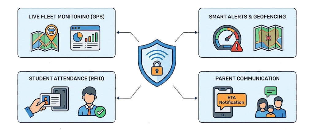 Overview The Safety & Tracking module is the "Peace of Mind" engine of the transport system. It combines GPS hardware, RFID technology, and mobile notifications to create a real-time safety net around students during their commute.